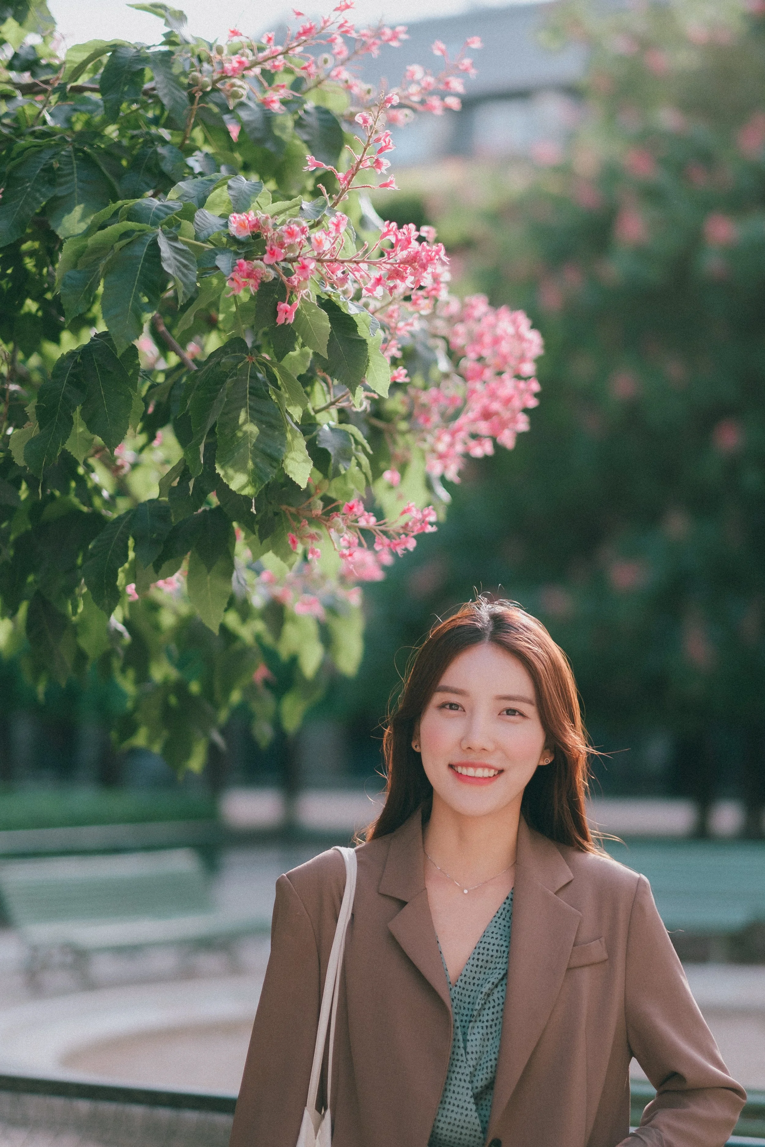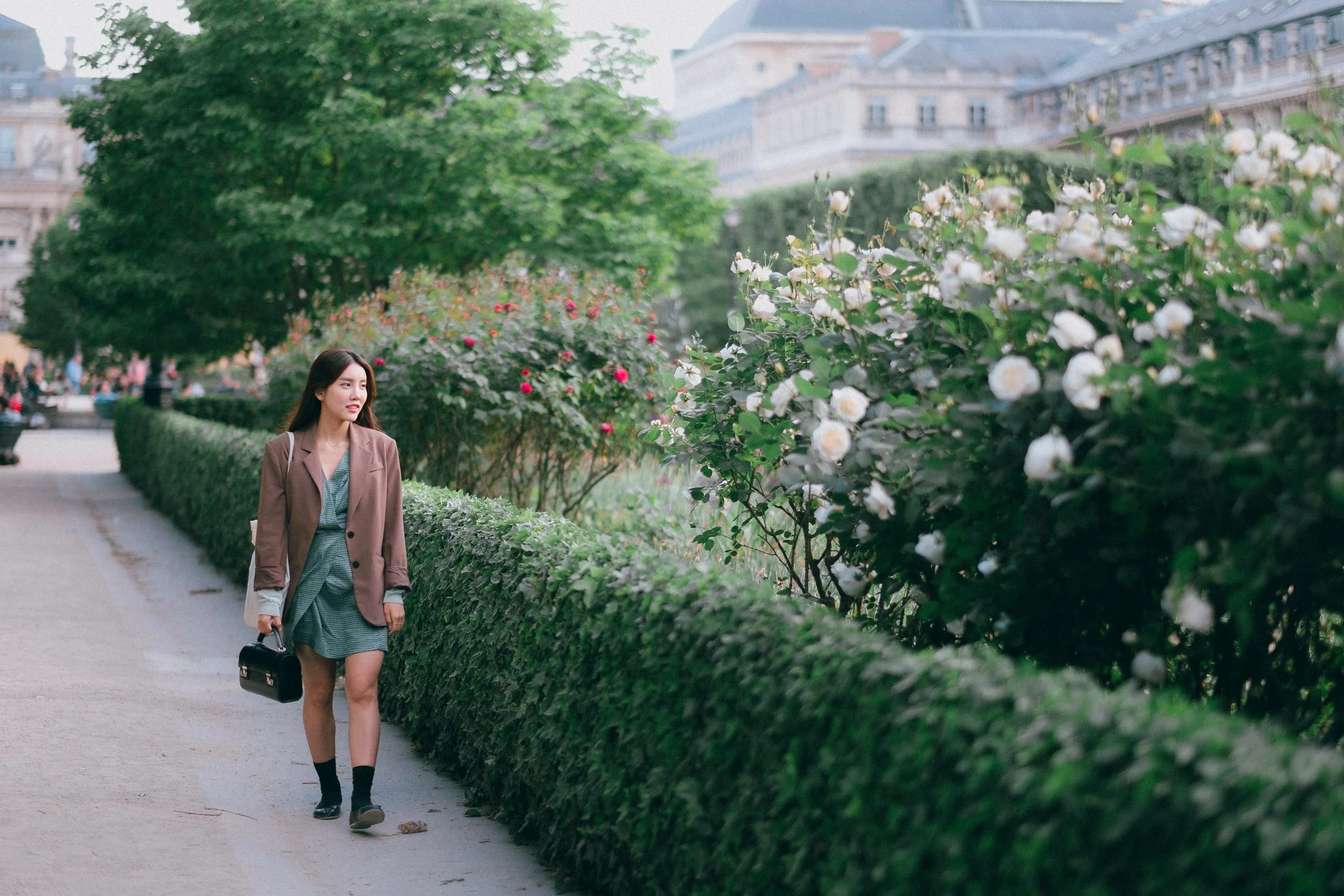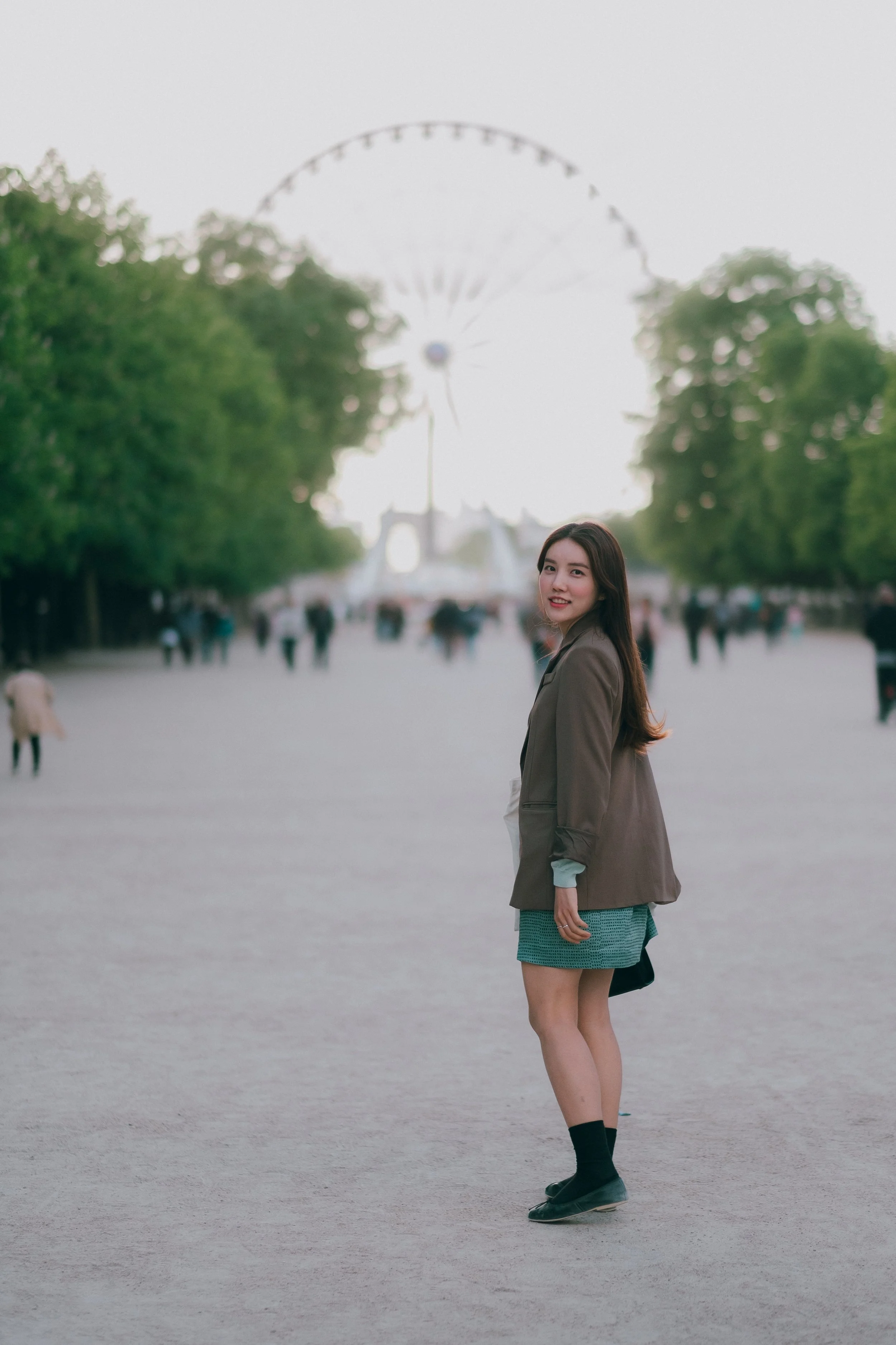 It was during the golden hour when the setting sun painted the sky with hues of amber and gold. I asked Mijin to pause in front of the grand fountain, with the magnificent Ferris wheel of Place de la Concorde framing her silhouette. The scene before me was one of those rare instances where every element aligned perfectly—the warm light, the gentle spray of the fountain, and the soft smile on Mijin's face. She looked at ease, her gaze reflecting a sense of wonder and contentment, almost as if she was part of the garden's own narrative. It was a moment that beautifully encapsulated the essence of Paris: timeless, elegant, and filled with a quiet joy. Capturing this image felt like freezing a piece of the magic that is Paris in the springtime.
