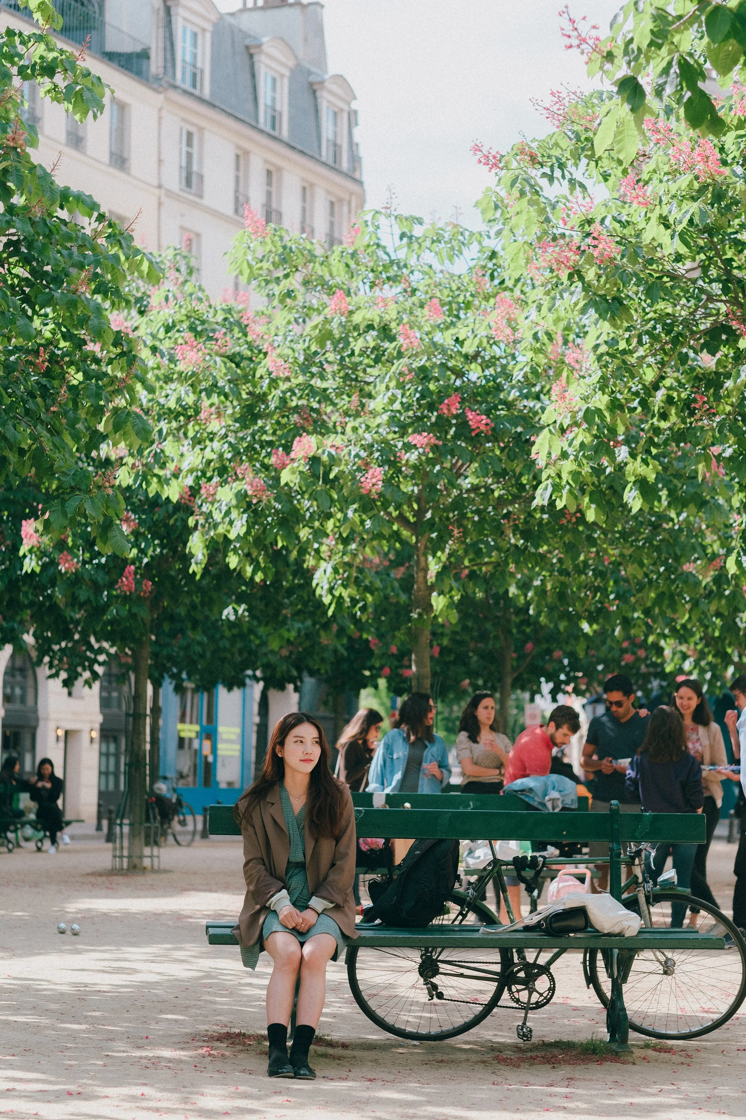 Our rendezvous was at Place Dauphine, an unassuming yet charming triangle of tranquility in the heart of the city. As we started our session, Mijin blended into the fabric of local life, her joy and anticipation echoing the spring's fresh promise.