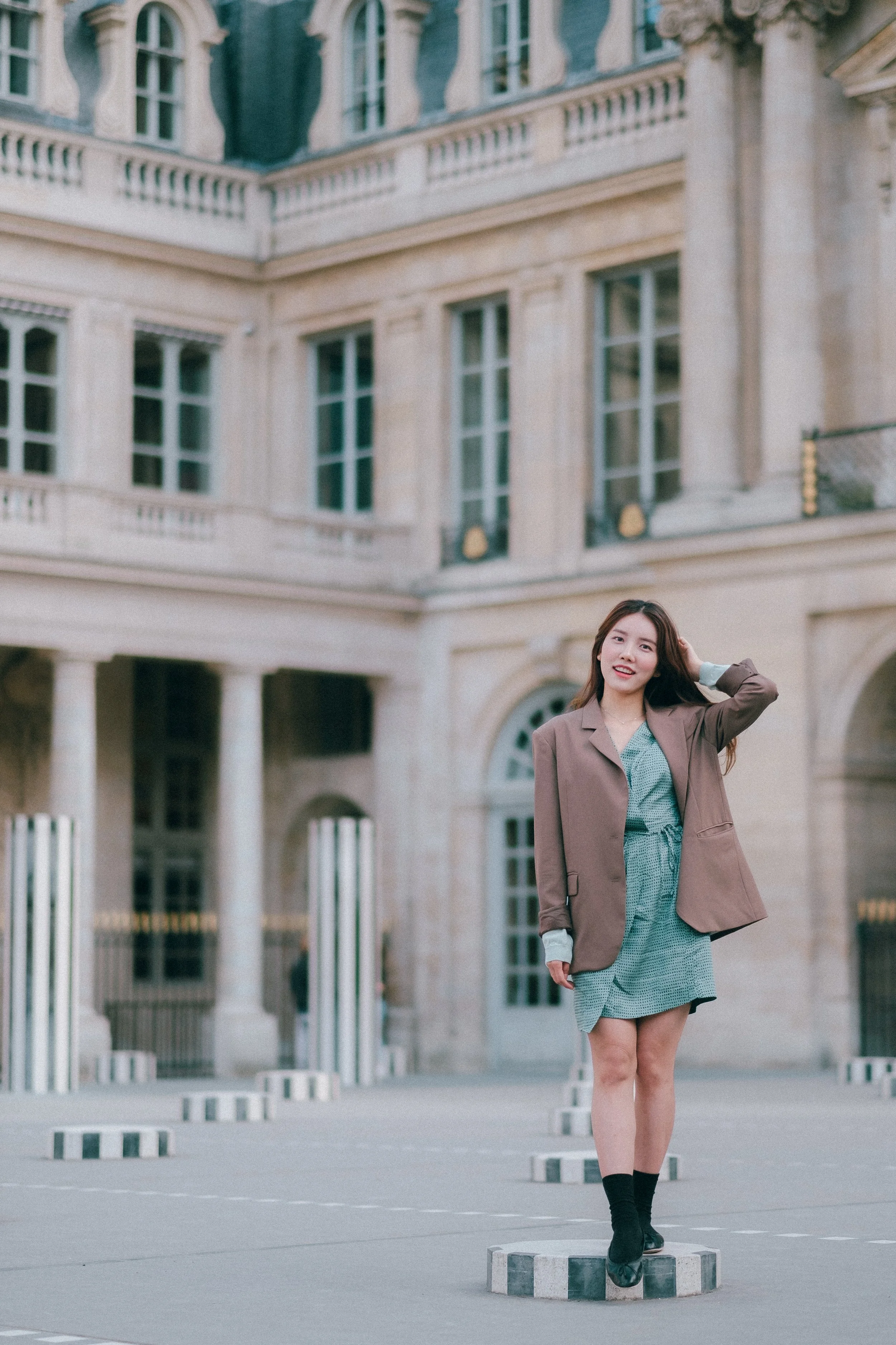 A candid moment captures her seated on Buren's columns, the soft hues of her attire complementing the monochrome pillars. She was framed by the sweeping architecture of the Palais-Royal, a tranquil observer of the bustling courtyard, where the past and present of Paris intersect.