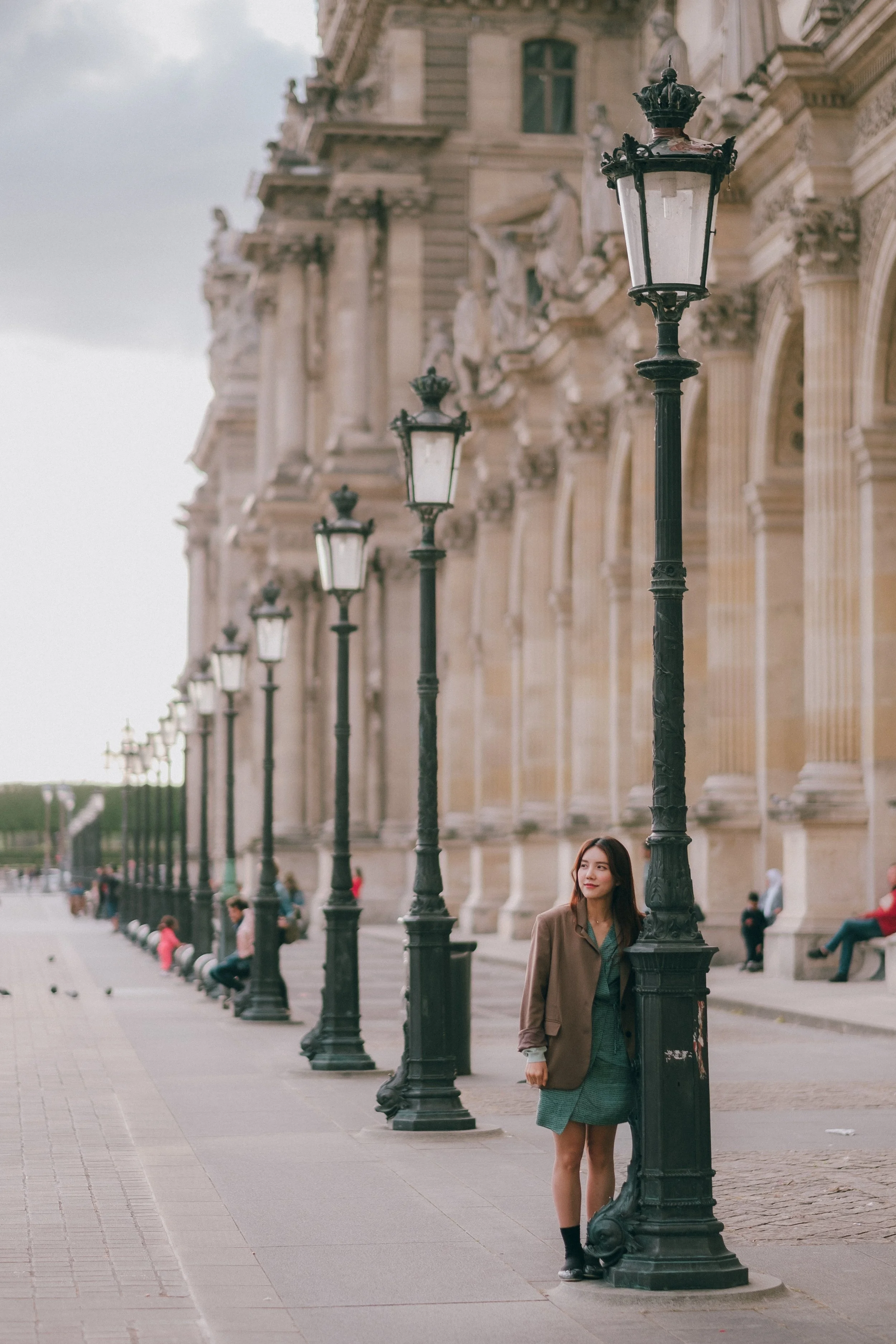 With the grandeur of the Louvre's facades stretching into the distance, she was leaning against a lamppost, her thoughts as deep as the history surrounding her. The silent sentinels of street lamps stood guard, echoing the solitude of exploration.